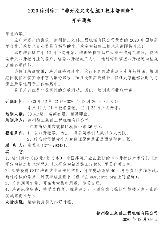本期培訓(xùn)班定于2020年12月22-26日在徐州舉辦(學(xué)員12月21日報(bào)名登記)。考慮到疫情秋冬季的不確定性,2020年非開挖水平定向鉆方向的培訓(xùn)班在徐州計(jì)劃就召開這一次。請有需要的單位,詳細(xì)閱讀本通知,并于2020年12月18日前完成報(bào)名。
