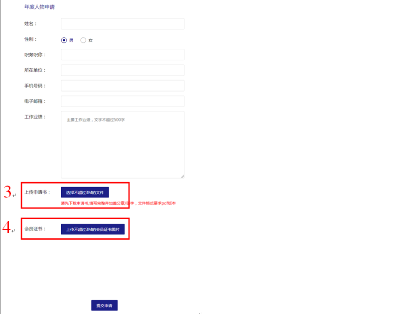4. 第四步:單擊“在線申請(qǐng)”,出現(xiàn)圖4所示頁(yè)面,按要求填寫。其中,在編號(hào)3處提交pdf版的CSTT年度人物申請(qǐng)表。在編號(hào)4處上傳中國(guó)地質(zhì)學(xué)會(huì)個(gè)人會(huì)員證。
